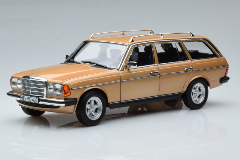 The Mercedes 200T S123 AMG Package Beige Norev 1:18 is crafted from Metall. Die-cast zinc alloy body with detailed plastic parts, rubber tires, and high-quality paint finish. Die-cast models are known for their weight, durability, and realistic feel.