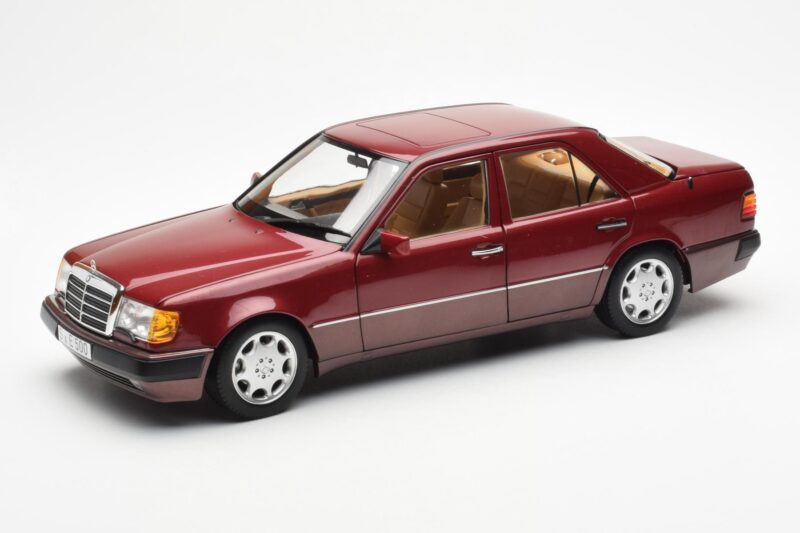 The Mercedes 500E W124 Röd Metallic Återförsäljarutgåva Norev 1:18 is crafted from Metall. Die-cast zinc alloy body with detailed plastic parts, rubber tires, and high-quality paint finish. Die-cast models are known for their weight, durability, and realistic feel.