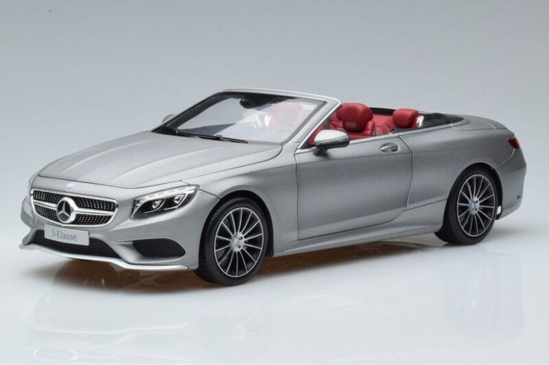The Mercedes S-Class A217 Cabriolet Grå Norev 1:18 is crafted from Metall. Die-cast zinc alloy body with detailed plastic parts, rubber tires, and high-quality paint finish. Die-cast models are known for their weight, durability, and realistic feel.
