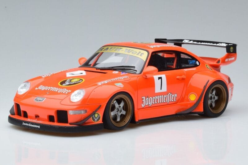 The Porsche 911 993 RWB Jagermeister Asia Edition GT Spirit 1:18 is crafted from Resin. High-quality resin with hand-painted details and limited production runs. Resin models offer exceptional detail and are prized by serious collectors for their craftsmanship.